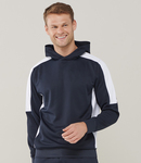 100% polyester. Brushed back fleece. Drop shoulder style. Three panel hood. Crossover neck detail. Contrast shoulder, upperarm and side panels (black and navy are self colour). Two front zip pockets. Ribbed cuffs and hem. Tear out label.