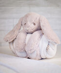 Light Brown soft plush rabbit. Contrast cream corduroy under ears and on paws. Hook and loop fastening on paws. Separate cream blanket in microfleece with contrast blanket stitching on edge. Delivered in a presentation bag with cream ribbon. Remove all hang tags and their fasteners before giving these items to a child. Suitable for children of all ages. Complies with EN71 European Toy Safety Regulations. BSCI certified. SEDEX certified.